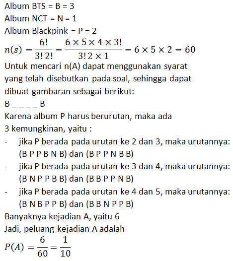 Salsa memiliki koleksi album boyband dan girlband asal korea selatan, diantaranya 3 album BTS, sebuah album NCT, dan 2 album Blackpink. Ia ingin menyusun semua albumnya pada rak baru. Misalkan A adalah kejadian susunan album sehingga album BTS berada di ujung kiri dan ujung kanan rak dan album Blackpink letaknya berurutan. Tanpa memperhatikan judul albumnya, peluang kejadian P adalah ....