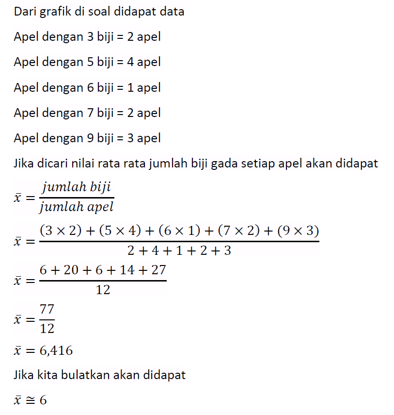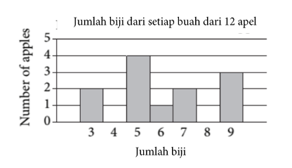 Dari grafik di atas, manakah diantara pilihan berikut yang paling mendekati rata-rata (arithmetic mean) jumlah biji per apel?