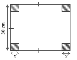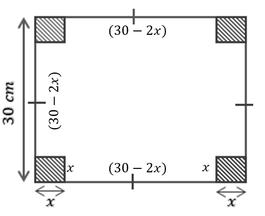 Dari selembar karton berbentuk persegi yang berukuran sisi 30 cm akan dibuat kotak tanpa tutup, dengan cara menggunting empat persegi di setiap pojok karton, seperti pada gambar. Volume kotak terbesar yang dapat dibuat adalah ….