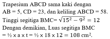 Pada trapesium sama kaki ABCD, garis AB sejajar dengan garis CD, AB = 5 cm, dan CD = 23 cm, serta titik M terletak di garis CD dengan BM = BC. Jika keliling trapesium ABCD 58 cm, luas segitiga BMC adalah … cm2.