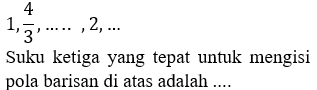 Karena suku ke 4 sama dengan 2, maka beda pada pola barisan di atas adalah 1/3, sehingga suku ketiganya adalah 5/3