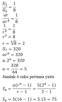 Perbandingan suku kedua dengan suku kelima pada barisan geometri yaitu 1 : 8. Jika suku ke 7 sama dengan 320. Maka jumlah 4 suku pertama pada barisan tersebut adalah ….