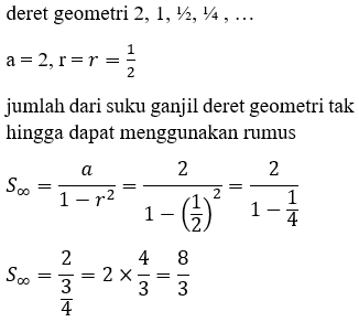• Jika diketahui suatu deret a + ar2 + ar4 + ... maka jumlah suku-suku pada kedudukan ganjil, yaitu: