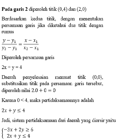 - Jika pernyataan yang dihasilkan benar, maka daerah tersebut merupakan penyelesaiannya. Jika pernyataan salah, maka daerah yang tidak memuat titik tersebut merupakan daerah penyelesaiannya