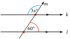 Karena garis k//l, akibatnya besar sudut 3x dengan besar sudut 60o membetuk sudut berpelurus