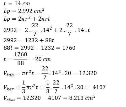 Sebuah tabung dengan tutup yang berjari-jari 14 cm memiliki luas permukaan 2.992 cm2. Jika sebuah kerucut dengan jari-jari dan tinggi yang sama dimasukkan ke dalam tabung tersebut, berapa volume sisa volume tabung diluar kerucut?