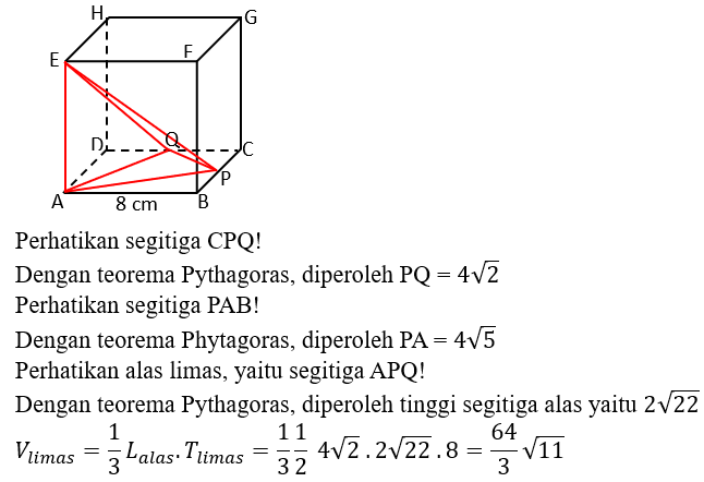Diketahui kubus ABCD.EFGH dengan panjang rusuk 8cm. Titik P dan Q berturut-turut adalah titik tengah dari garis BC dan CD. Volume limas APQ.E yaitu ….