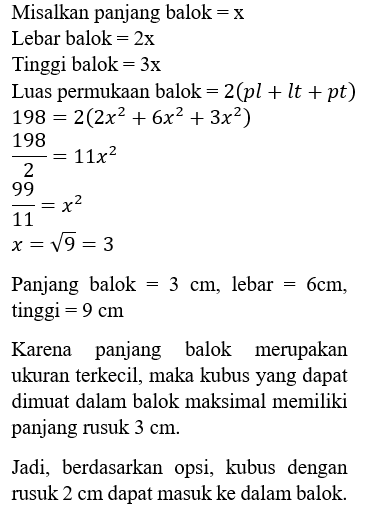 Diketahui sebuah balok dengan perbandingan panjang, lebar, dan tinggi berturut-turut adalah 1 : 2 : 3 memiliki luas permukaan 198 cm2. Jika sebuah kubus akan dimasukkan ke dalam balok, maka rusuk kubus berikut agar kubus dapat muat dalam balok adalah ….