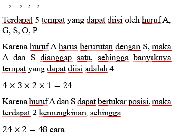 Susunan huruf-huruf A, G, S, O, dan P dengan huruf A dan S selalu berdampingan. Banyaknya susunan huruf yang dapat dibentuk adalah ….