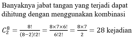 Sandi akan mengadakan reuni dengan teman-temannya sebanyak 8 orang. Mereka saling berjabat tangan satu sama lain. Kejadian jabat tangan yang terjadi dilakukan sebanyak ….