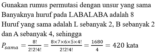 Banyak kata yang dapat disusun dari huruf LABALABA adalah ….
