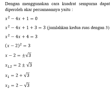 Salah satu akar dari persamaan x2 – 4x + 1 = 0 adalah ….