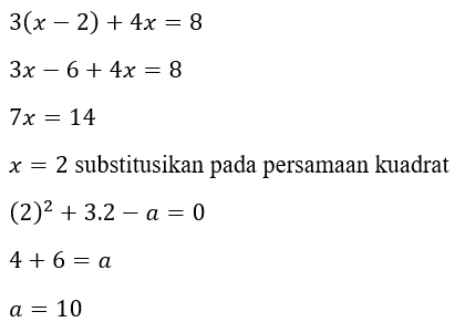 Apabila solusi dari 3(x – 2) + 4x = 8 memenuhi x2 + 3x – a = 0. Maka nilai a adalah ….