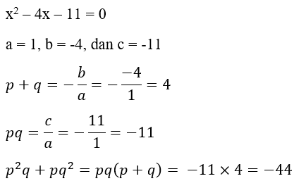 Diketahui persamaan kuadrat x2 – 4x – 11 = 0 dengan akar p dan q. Nilai p2q + pq2 = ….