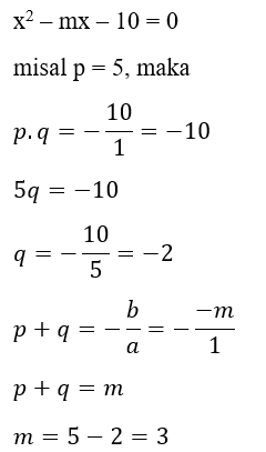 Persamaan kuadrat x2 – mx – 10 = 0. Jika salah satu nilai x yang memenuhi adalah 5. Maka nilai m = ….