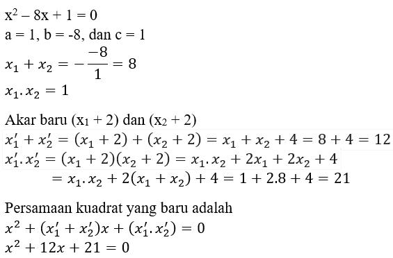 Sebuah persamaan kuadrat x2 – 8x + 1 = 0 memiliki akar persamaan x1 dan x2. Persamaan kuadrat baru dengan akar (x1 + 2) dan (x2 + 2) adalah ….