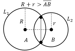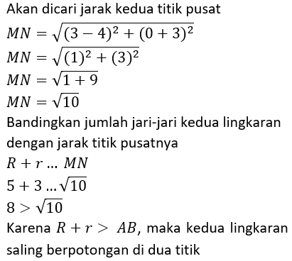 1. Jika D > 0, kedua lingkaran saling berpotongan di dua titik. Sehingga diperoleh: