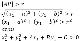 1. Titik di luar lingkaran, jika dan hanya jika panjang AP lebih besar dari jari-jari lingkaran, secara sistematis dapat dituliskan: