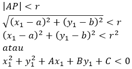 3. Titik di dalam lingkaran, jika dan hanya jika panjang AP kurang dari jari-jari lingkaran, secara sistematis dapat dituliskan: