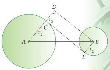 AB adalah jarak kedua titik pusat lingkaran (s). DE adalah garis singgung persekutuan luar dua lingkaran, dimana DE tegak lurus dengan AD. Melalui titik B, dapat ditarik garis BC yang sejajar garis DE (BC//DE), sehingga BE = CD = r2, dan sudut ACB = 90o.