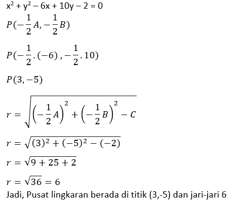Sebuah lingkaran memiliki persamaan x2 + y2 – 6x + 10y – 2 = 0, pusat dan jari-jari lingkaran tersebut berturut-turut adalah ....