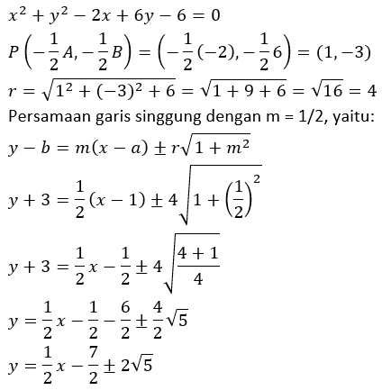 Diketahui lingkaran L memiliki persamaan x2 + y2 – 2x + 6y – 6 = 0. Persamaan garis singgung lingkaran L yang bergradien 1/2, yaitu ....