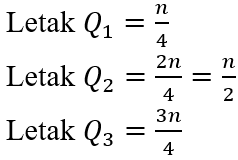Kuartil membagi data menjadi 4 kelompok dengan pembaginya sebanyak 3 kuartil, yaitu kuartil bawah (Q1), kuartil tengah / median (Q2), dan kuartil atas (Q3). Dalam menentukan kuartil, kita harus menentukan letak dari kuartil terlebih dahulu dengan cara :