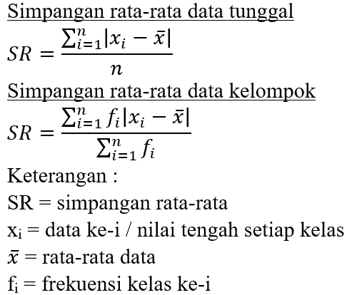 Simpangan rata-rata adalah nilai rata-rata dari selisih setiap datum dengan nilai rataan hitung. Simpangan rata-rata antara data tunggal dan data kelompok dapat dirumuskan sebagai berikut: