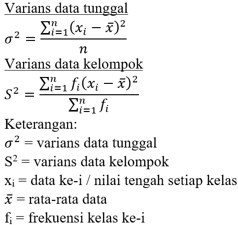 Ragam atau biasa disebut varians digunakan untuk mengukur seberapa jauh sebuah data tersebar. Apabila nilai varians sama dnegan nol, maka seluruh data memiliki nilai yang sama. Varians data tunggal dan data kelompok dapat dirumuskan sebagai berikut: