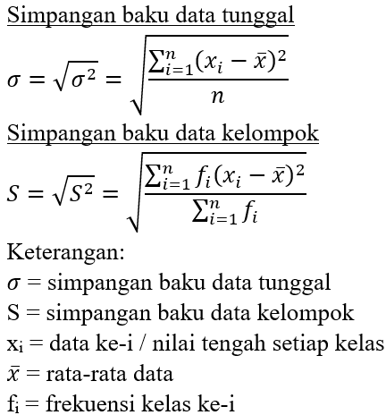Simpangan baku atau bisa disebut juga dengan standar deviasi merupakan akar kuadrat dari varians. Simpangan baku data tunggal dan data kelompok dapat dirumuskan sebagai berikut: