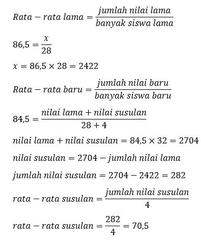 Rata-rata nilai ulangan Matematika 28 siswa adalah 86,5. Kemudian terdapat 4 siswa yang mengikuti ulangan susulan. Nilai rata-rata ulangan setelah digabungkan menjadi 84,5. Nilai rata-rata ke empat siswa yang mengikuti ulangan susulan adalah ….