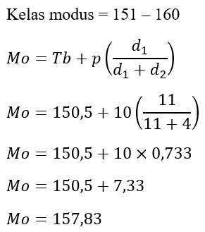 Sedangkan modus pada data kelompok dapat ditentukan dengan cara berikut: