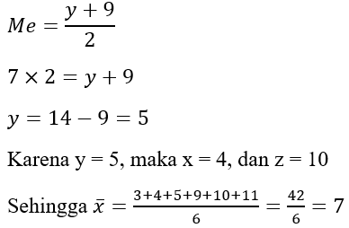 Diketahui data terurut yang merupakan bilangan asli, yaitu 3, x, y, 9, z, 11. Jika median datanya sama dengan 7, maka rata-ratanya adalah ….