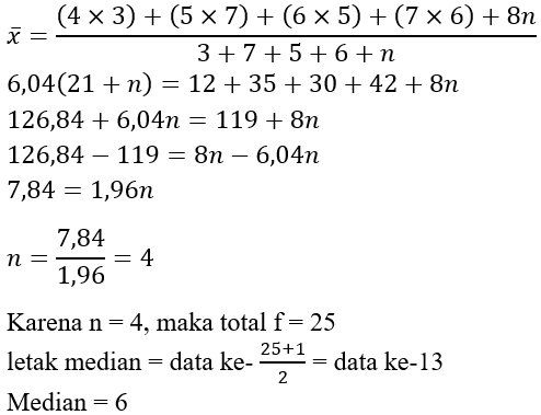 Jika rata-rata data diatas adalah 6,04. Maka median data di atas adalah….