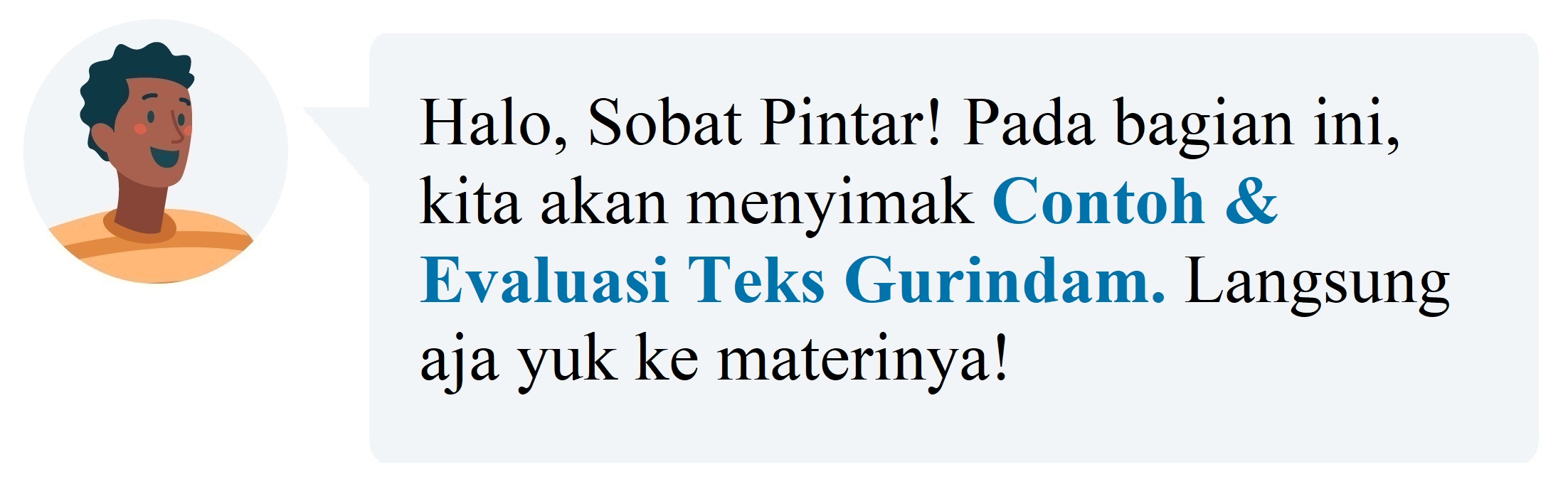 Setelah mengetahui apa itu gurindam, ciri-ciri dan fungsinya, selanjutnya kita akan menyimak contoh gurindam dan mengevaluasinya. Mengevaluasi adalah memberikan penilaian terhadap sesuatu. Hasil dari evaluasi adalah diperolehnya suatu kesimpulan apakah sesuatu itu baik atau buruk, benar atau salah, layak atau perlu perbaikan, dan lain sebagainya. Selain itu, untuk evaluasi kali ini, kita juga akan menyimak pesan yang terkandung dalam gurindam tersebut dan menentukan apakah pesan tersebut masih relevan dengan kondisi saat ini.