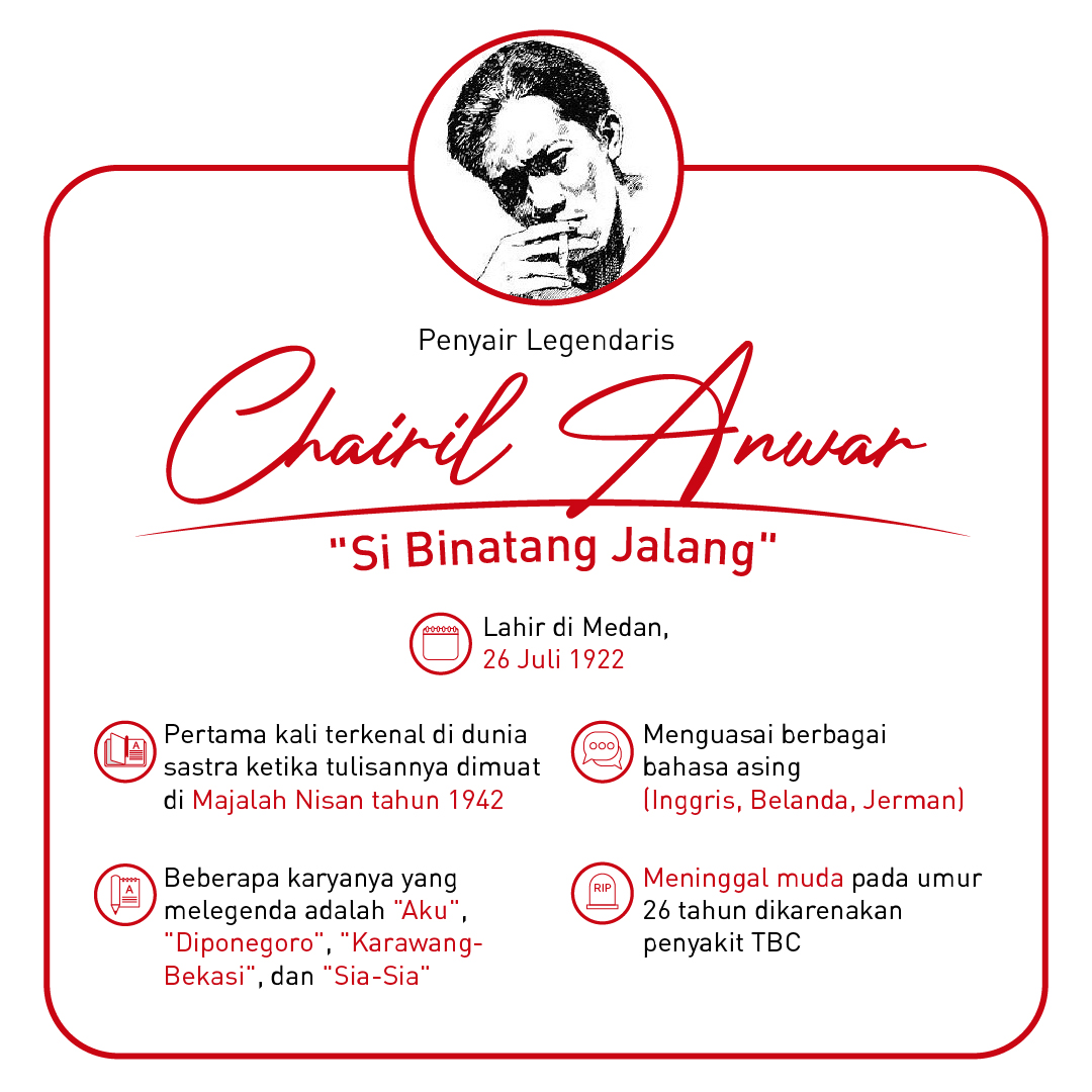 Pada gambar di atas, sobat dapat menemukan informasi kapan Chairil Anwar dilahirkan, bagaimana perjalanan kariernya selama menjadi seorang sastrawan terkenal, hingga kronologi kematiannya.