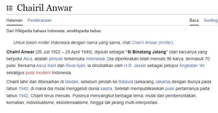 Informasi mengenai tokoh-tokoh terkenal bisa Sobat dapatkan melalui artikel, Wikipedia, ensiklopedia, maupun buku-buku biografi yang beredar luas di masyarakat. Wikipedia merupakan ensiklopedia daring (dalam jaringan) yang terbesar dan terpopuler di dunia saat ini. Wikipedia dapat diakses melalui internet, bahkan tersedia dalam berbagai bahasa, termasuk bahasa Indonesia. Berikut contoh informasi tentang Chairil Anwar di dalam Wikipedia.