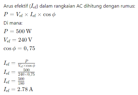 Sebuah motor listrik dengan daya aktif 500 W memiliki faktor daya 0,75 dan dioperasikan pada tegangan 240 V. Berapakah arus yang mengalir melalui motor tersebut?