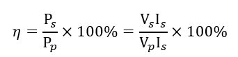 Efisiensi transformator menggambarkan sejauh mana energi input dikonversi menjadi energi output. Karena adanya kerugian daya di dalam transformator, efisiensinya kurang dari 100% yaitu: