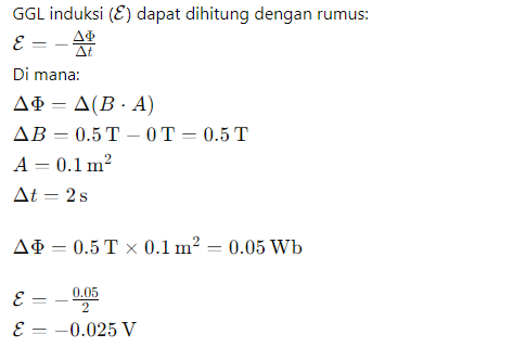 Sebuah kawat melingkar dengan luas penampang 0,1 m2 berada dalam medan magnet homogen sebesar 0,5 T. Jika medan magnet berubah dari 0,5 T menjadi 0 T dalam waktu 2 detik, berapakah besar GGL induksi yang dihasilkan?