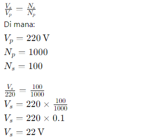 Sebuah transformator step-down memiliki 1000 lilitan pada kumparan primer dan 100 lilitan pada kumparan sekunder. Jika tegangan input pada kumparan primer adalah 220 V, berapakah tegangan output pada kumparan sekunder?