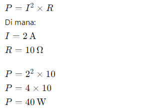 Sebuah resistor dengan hambatan 10 Ohm dilewati oleh arus sebesar 2A. Daya yang dipancarkan oleh resistor tersebut adalah....