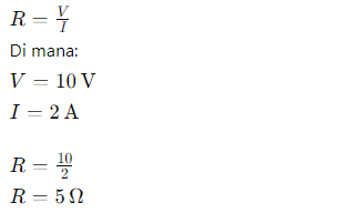 Sebuah resistor memiliki tegangan 10 V dan arus yang mengalir sebesar 2 A. Berdasarkan hukum Ohm, besar hambatan resistor tersebut adalah....