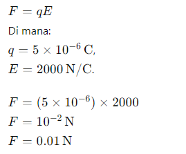 Sebuah muatan positif 5 x 10-6 C diletakkan dalam medan listrik sebesar 2000N/C. Besar gaya yang bekerja pada muatan tersebut adalah....