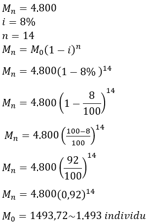 Populasi gajah Sumatera kian tahun kian menurun. Pada tahun 2007, diperkirakan populasi gajah Sumatera hanya sebanyak 4.800 individu. Dikarenakan perburuan liar dengan tujuan mengambil gading gajah, populasi gajah Sumatera berkurang 8% setelah 14 tahun. Berapakah populasi gajah Sumatera pada tahun 2021?