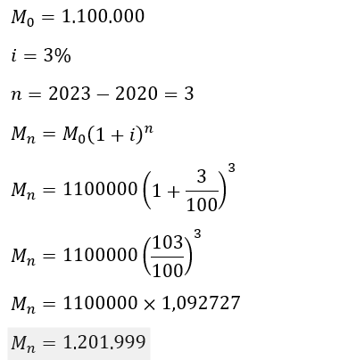 Penduduk sebuah kota mengalami peningkatan sebesar 3% tiap tahun dari tahun sebelumnya. Berdasarkan sensus penduduk tahun 2020, jumlah penduduk di kota tersebut 1.100.000 jiwa. Tentukan jumlah penduduk di kota tersebut pada tahun 2023!
