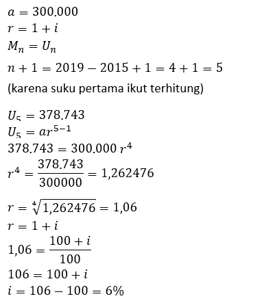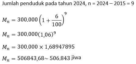 Sebuah kota mengalami pertumbuhan penduduk sebesar x% setiap tahun dari tahun sebelumnya. Berdasarkan sensus penduduk pada tahun 2015, jumlah penduduk di kota tersebut sebanyak 300.000 jiwa. Jika pada tahun 2019 jumlah penduduk di kota tersebut sebanyak 378.743 jiwa, Jumlah penduduk pada tahun 2024 adalah ….