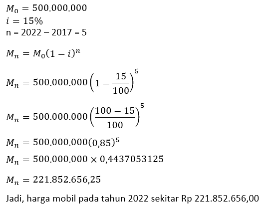 Seseorang membeli mobil pada tahun 2017 seharga Rp 500.000.000,00. Mesin tersebut mengalami penurunan harga sebesar 15% setiap tahun dari tahun sebelumnya. Harga mesin pada tahun 2022 adalah ….