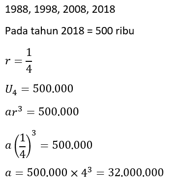 Berdasarkan penelitian, diketahui bahwa populasi hewan A berkurang menjadi seperempatnya tiap 10 tahun. Pada tahun 2018 populasinya bersisa 500 ribu ekor. Populasi hewan A pada tahun 1988 adalah ….