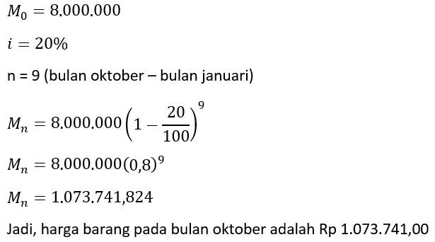 Harga suatu barang menyusut setiap bulan 20% dari harga pada awal tahun. Jika harga barang tersebut Rp 8.000.000,00. Harga barang pada bulan Oktober adalah ….